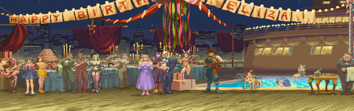 In Ken's Street Fighter Zero/Alpha 2 stage you can see a lot of easter egg appearances in the background. It's Eliza's birthday party (Ken's gf/wife) on Ken's boat and everybody's dressed up as a Capcom character, it's not the actual characters themselves.