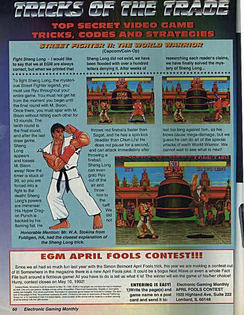 "Fans of Street Fighter are well accustomed to the story of Sheng Long. Street Fighter II was already well popular in the arcades when the April issue of Electronic Gaming Monthly came out. There was a story about a secret character in SFII. His name: Sheng Long, the supposed master of Ryu and Ken. To reach him, you had to go a certain amount of matches against Bison without touching him. If that condition was fulfilled, Sheng Long would come up and kill Bison and you would fight him instead. His style was essentially a mix of Ryu's and Ken's styles, but was much faster and dealt much more damage. When the issue came out, millions literally pumped quarters into SFII machines, trying to get to this nonexistent character. Capcom had neither confirmed nor denied the Sheng Long story and it was only much later that EGM themselves admitted that it was just an April Fools' joke... or was it? 'Sheng Long' is the Chinese pronunciation of 'Shou Ryuu' (as in Shou Ryuu Ken).